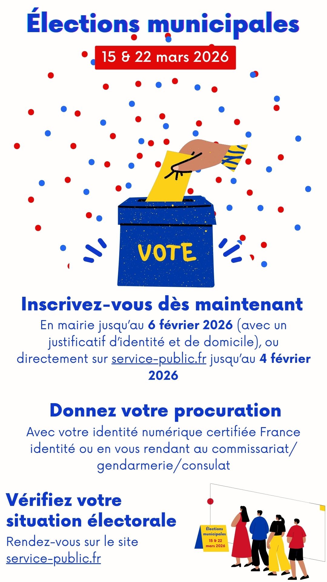 Pour pouvoir voter aux prochaines élections, il est nécessaire de vous inscrire sur les listes électorales de votre commune. L’inscription sur les listes électorales peut être réalisée en ligne jusqu’au sixième mercredi précédant le scrutin.