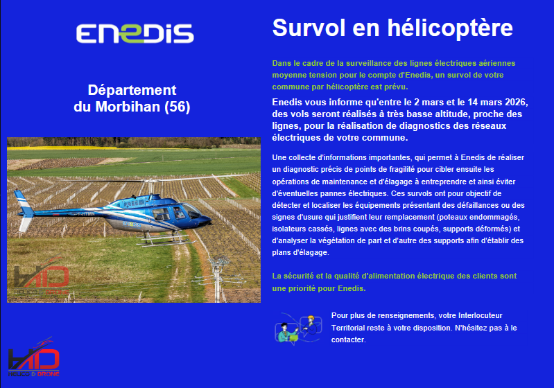 Dans le cadre de la surveillance des lignes électrique d'ENEDIS, nous vous informons qu'un hélicoptère survolera la commune à très basse hauteur.
